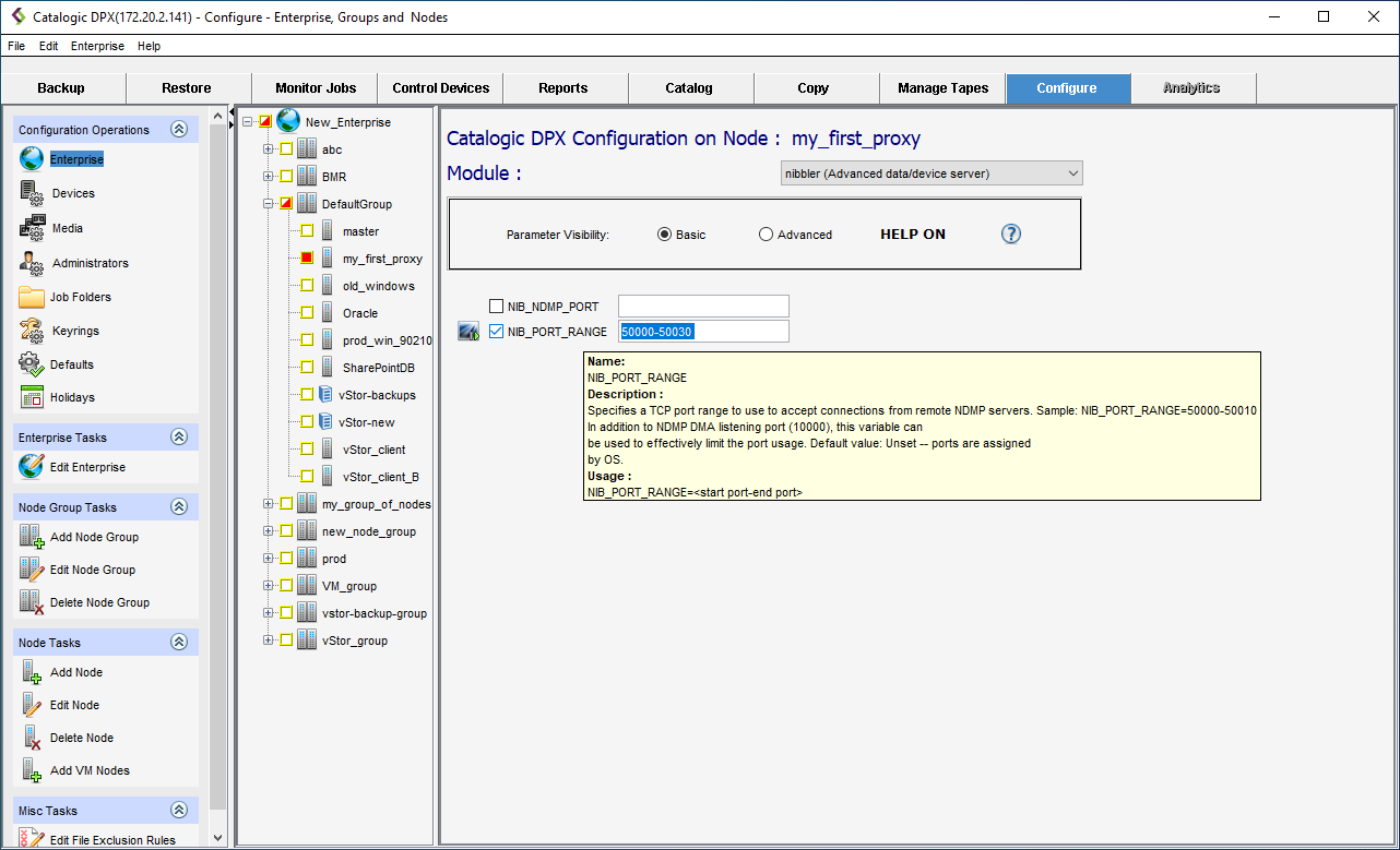 You can configure various settings for Catalogic DPX as well as the nodes and utilities by editing their configuration parameters. There are two ways to edit the parameters: from the Parameter Configuration Interface in the Java-based DPX Management Interface and by editing the parameter files or registries in the Catalogic DPX Master Server.