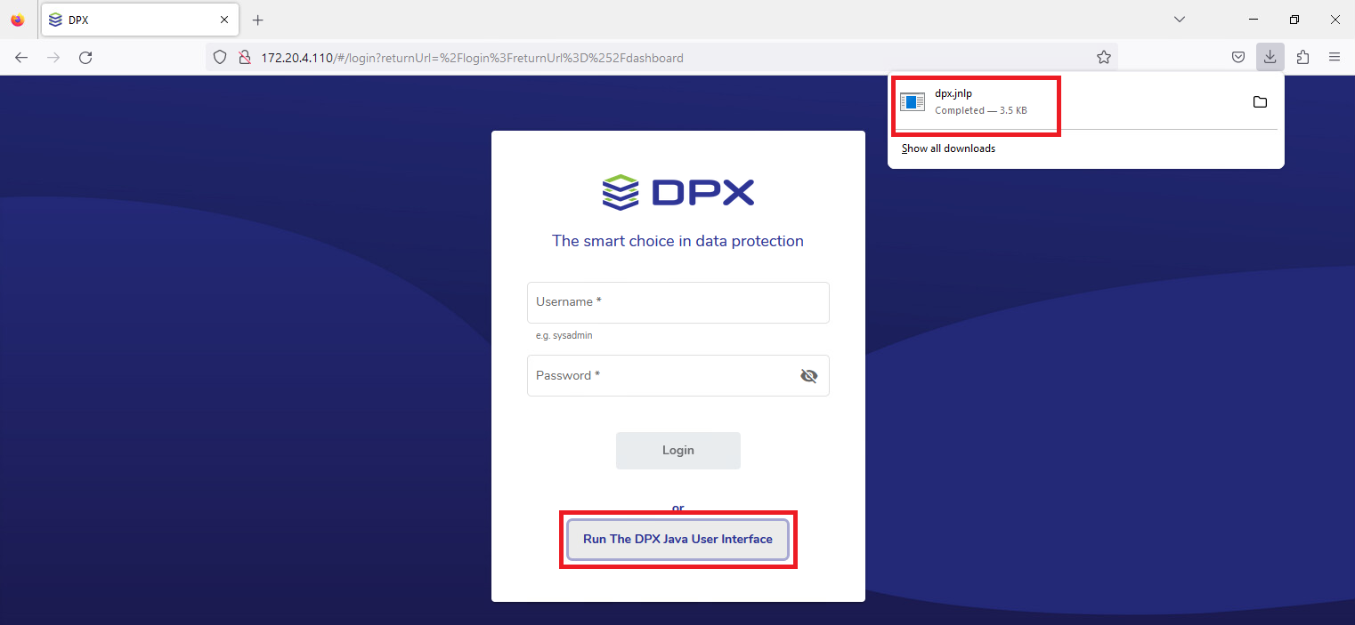 - If you are launching the desktop interface for the first time, select Run the DPX Java User Interface. This will start the download of the dpx.jnlp file which is used to launch the desktop interface app. If you already have the file downloaded, proceed to step 2.