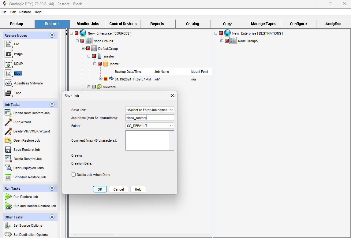 1. Now you can create a Job Name, select a Folder, and add a Comment to your restore job. When you click OK, your Block Restore Job will be saved.