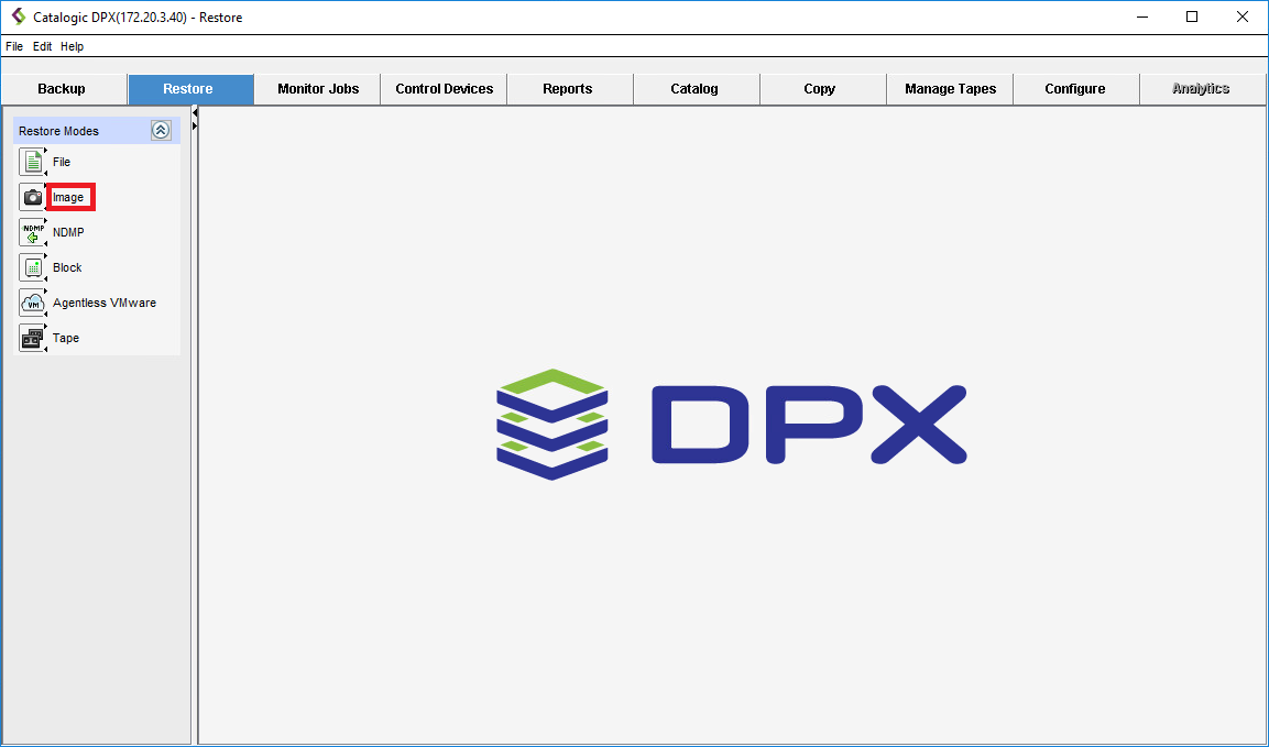 In Catalogic DPX version 4.10, only the desktop interface supports Image backups and restores.
