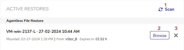 - If you cannot see your Agentless File Restore mounting point, click Scan to refresh the view (item 1 below).