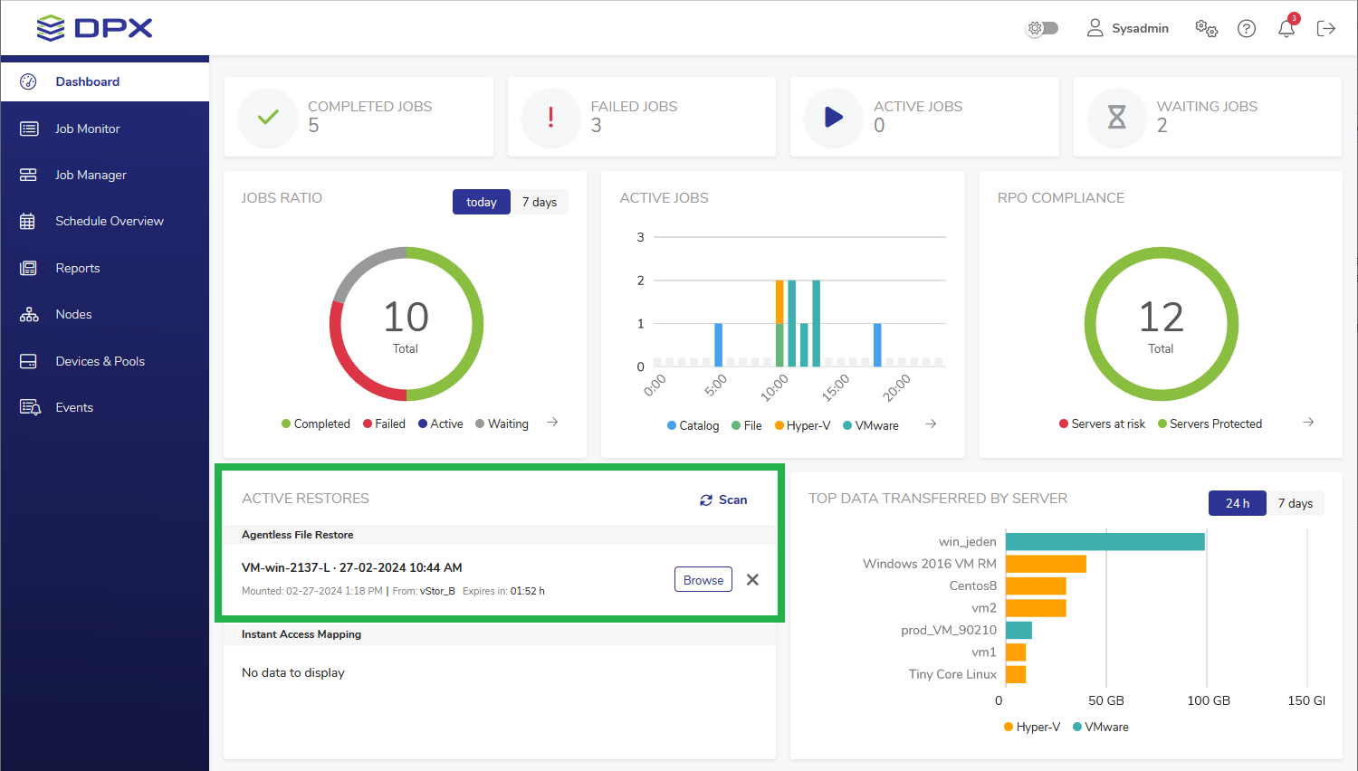 - The VM object list shows all VMs you backed up using the DPX Agentless Backup. The available objects to restore can be sorted by Name, Type, associated Job Name, the backup Date/Time, or by Size.