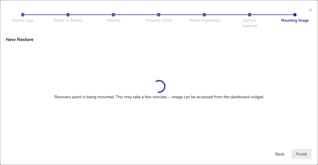 9. In the Mounting Image step, wait for DPX to mount the selected volume.![[image expected here]](/assets/images/Instant Access - mounting image (windows)-3d02983b1e39f4521e2a04852d640244.png)