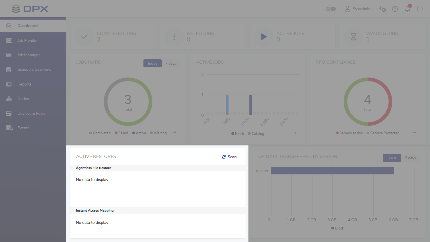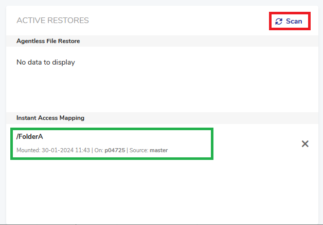 If you cannot see the freshly mounted volume in the Active Restores widget, click Scan and wait a few moments. DPX Master Server will communicate with the Clients to retrieve information about the mounted volume.![[image expected here]](/assets/images/Instant Access - mounting image - Dashboard view (Scan detail)-b97a543840c5bda7dc38e2f1ec7c1d35.png)