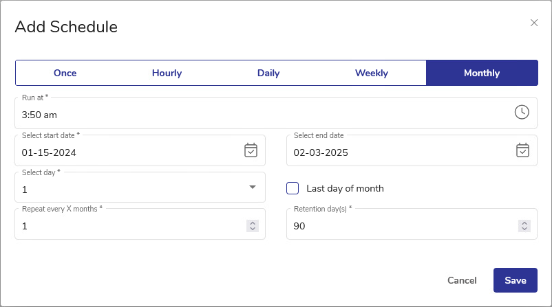 The dialog will display slightly different parameters to select depending on the selected frequency. Below is the Monthly schedule view.