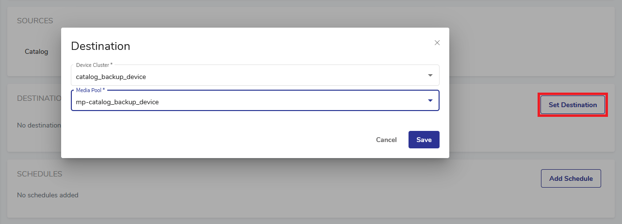 1. You may also add a schedule in the SCHEDULES pane for the backup to be run on a regular basis. See Scheduling a Catalog Backup Job.