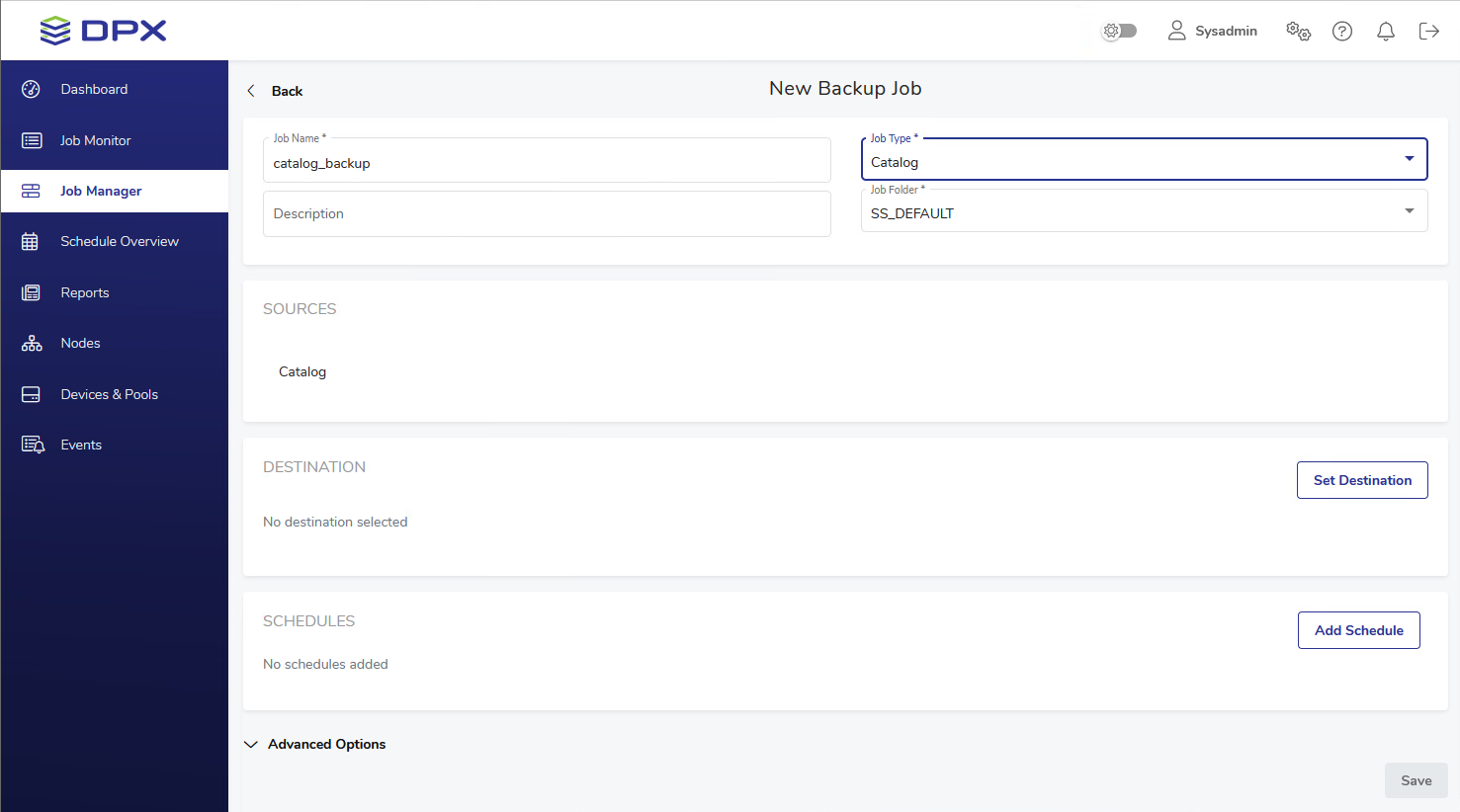 Creating a Catalog backup requires that there is at least one device and at least one media added to your DPX.