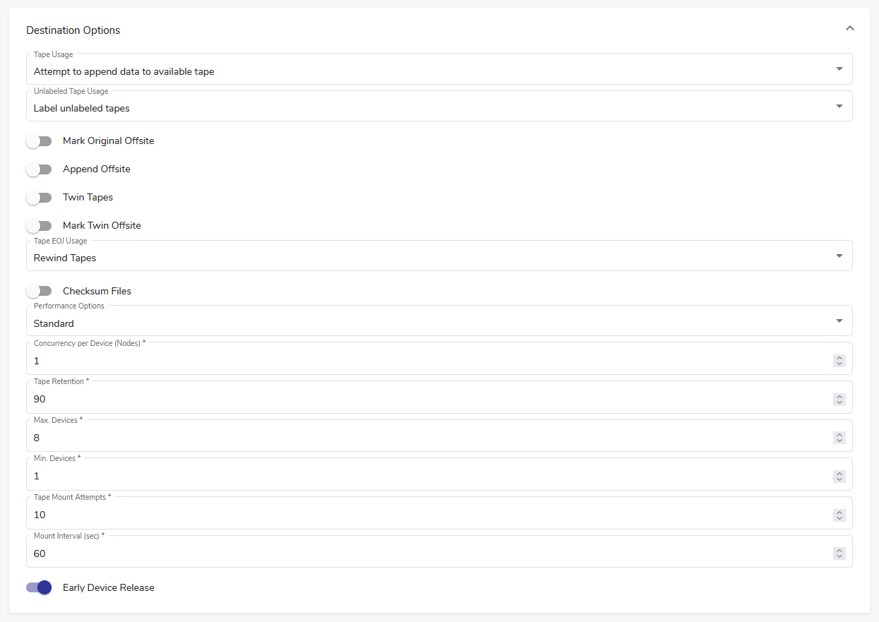 | Leave Tapes | In the case of standalone tape drives, the tape remains wound to the point where the job ended and stays in the drive. However, for tape library drives, the tape is always attempted to be returned to its slot after the backup operation is completed. The next job attempts to use the tape in the drive instead of mounting a new tape. In the case of standalone drive, if the currently mounted tape is unacceptable (for example, if the next backup requires a tape from a different media pool), the operator is prompted to mount another tape. In the case of a tape library, if the tape in the drive is rejected for any reason, it unloads the tape, returns it to its slot, and proceed to select another tape. |