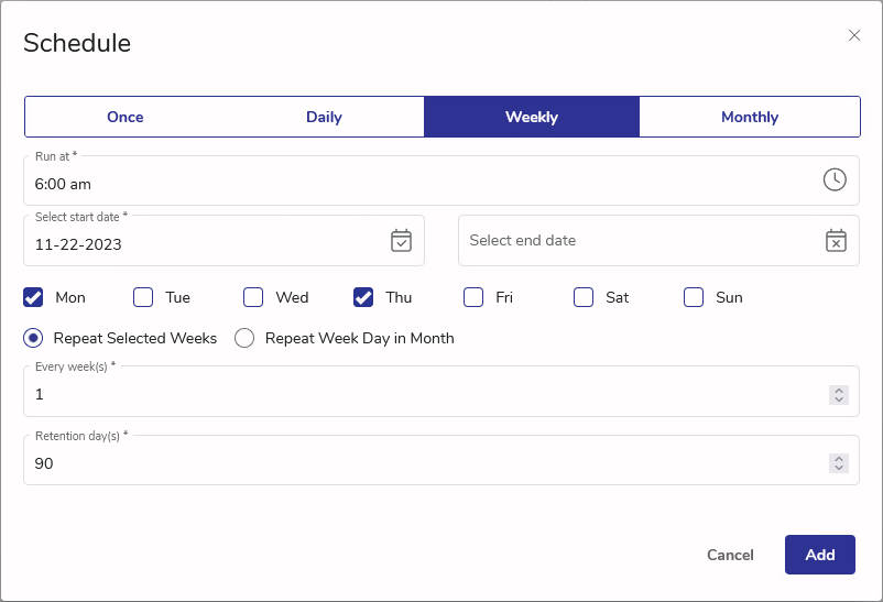 Depending on the selected frequency, the dialog will display slightly different parameters to select. Below, the Weekly schedule view is shown.