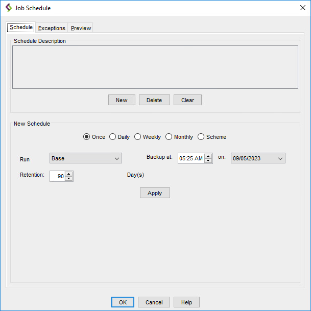 This dialog box contains three tabs along the top: Schedule, Exceptions, and Preview.- The Schedule tab allows you to define the dates and times you want the current job to run.