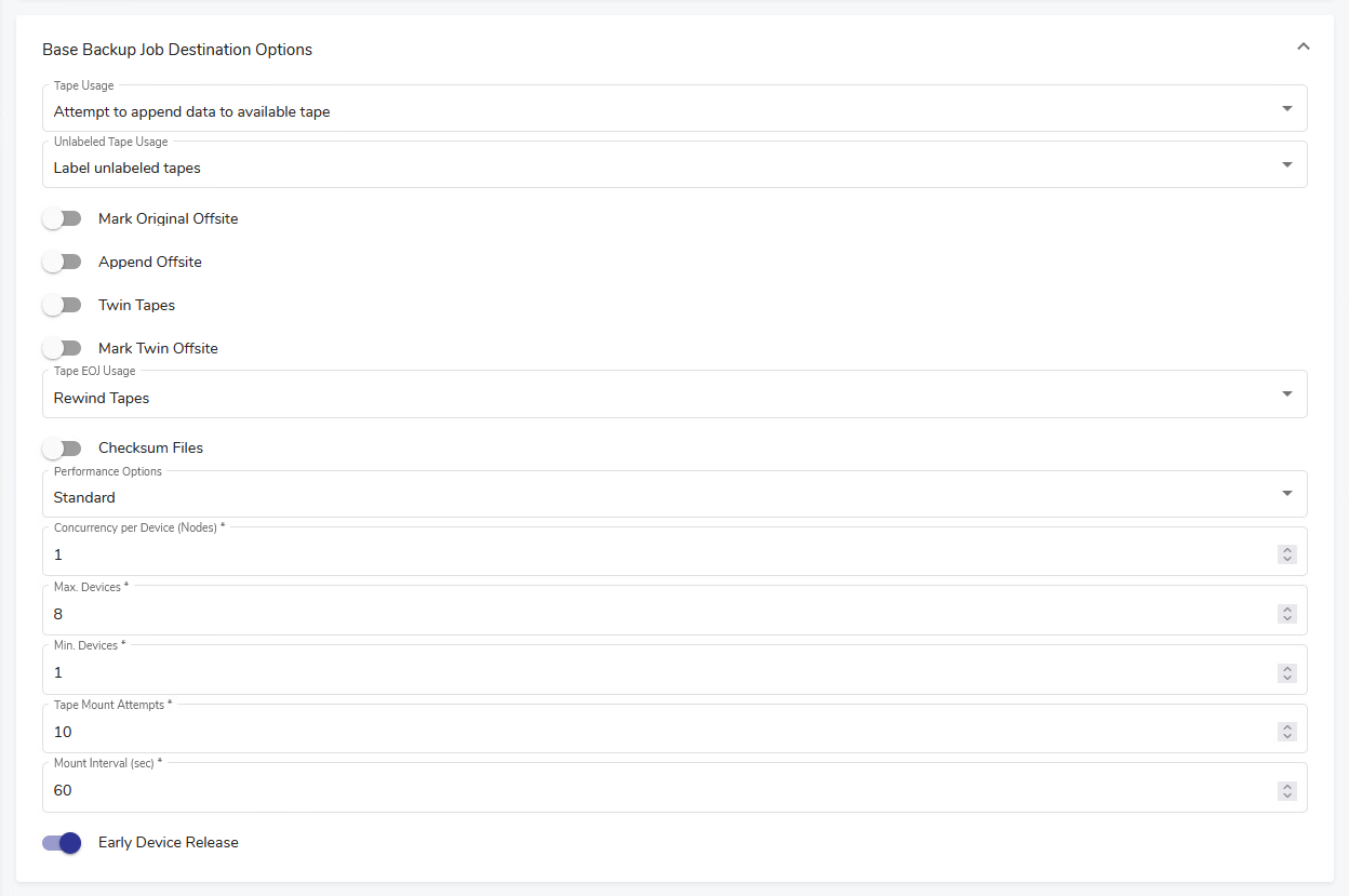 | Leave Tapes | In the case of standalone tape drives, the tape remains wound to the point where the job ended and stays in the drive. However, for tape library drives, the tape is always attempted to be returned to its slot after the backup operation is completed. The next job attempts to use the tape in the drive instead of mounting a new tape. In the case of standalone drive, if the currently mounted tape is unacceptable (for example, if the next backup requires a tape from a different media pool), the operator is prompted to mount another tape. In the case of a tape library, if the tape in the drive is rejected for any reason, it unloads the tape, returns it to its slot, and proceed to select another tape. |