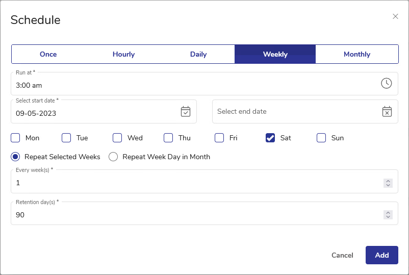 - Select all required parameters, such as the schedule starting time and date, day of the week (if applicable), repetition period, backup retention time, etc.