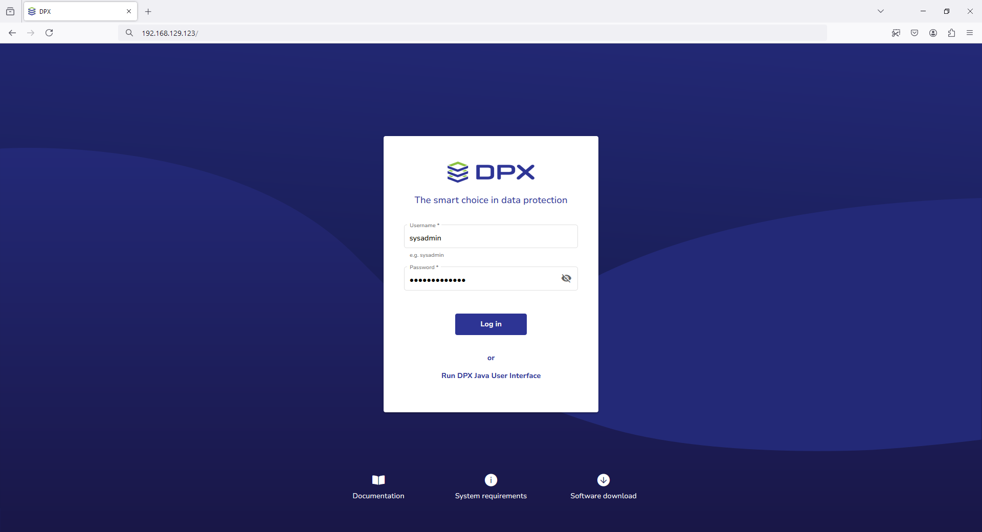 - In the login screen, enter the username and password for the Catalogic DPX Master Server.