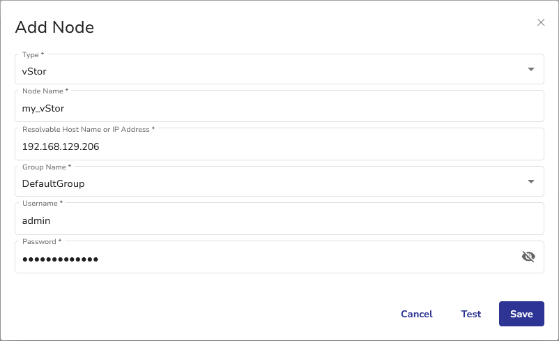 - Optionally, click Test to verify the credentials, and to confirm the connectivity with the vStor.
