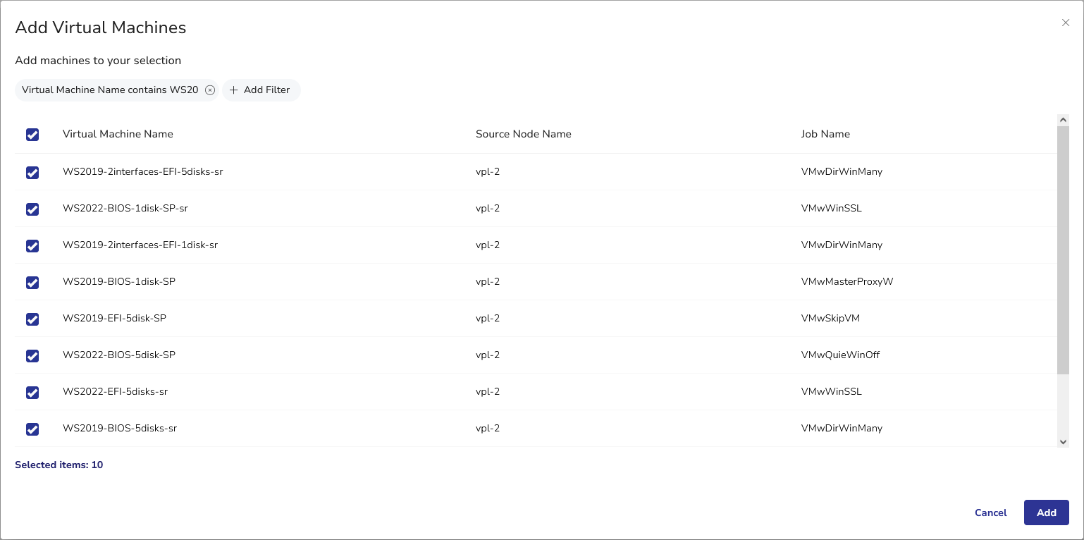 - Select the virtual machines you want to restore and click Add.