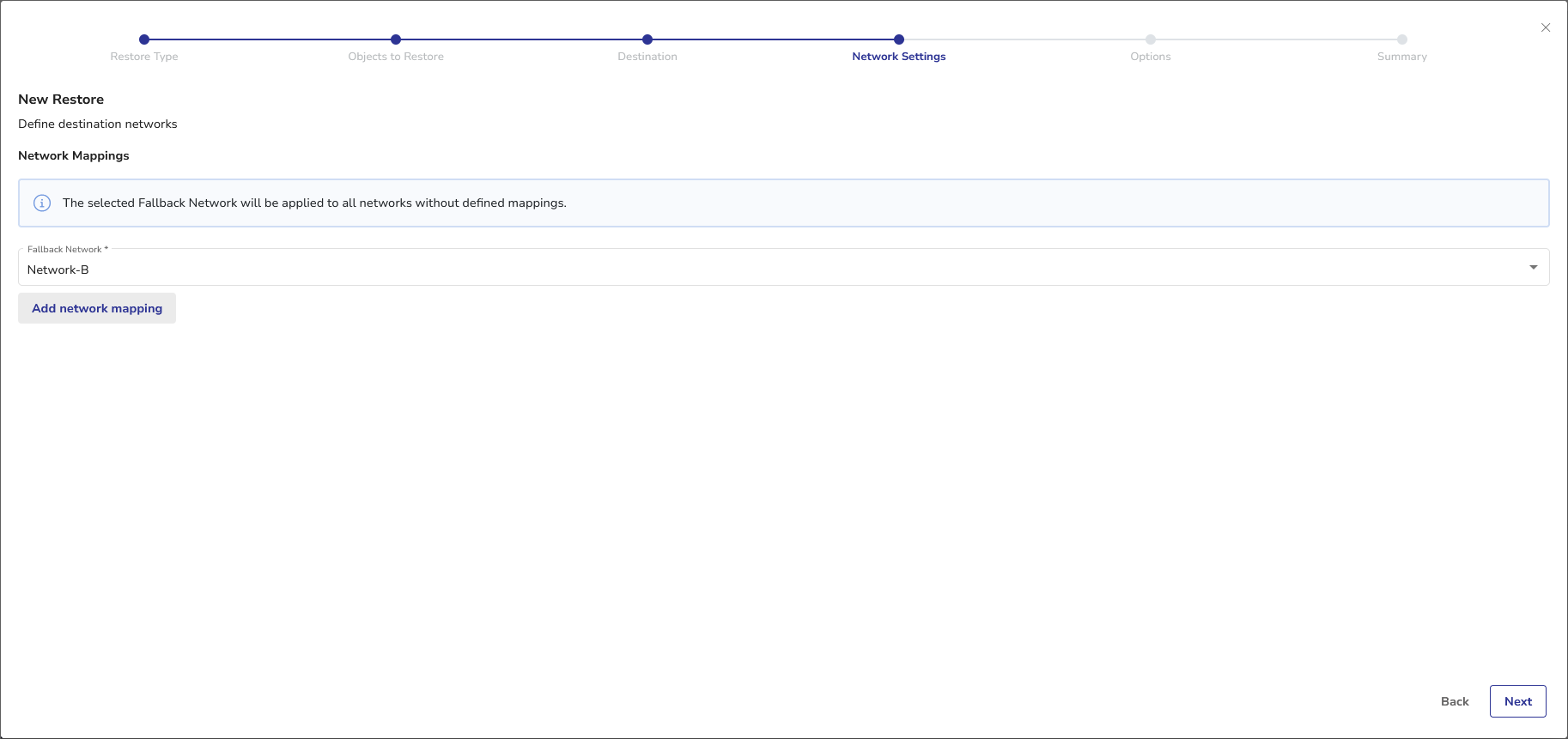 One of the networks available in the target vCenter is selected as the Fallback Network, i.e. all virtual machines without network mapping defined will be restored to this network. You can change this setting, by choosing another available network from the Fallback Network dropdown.