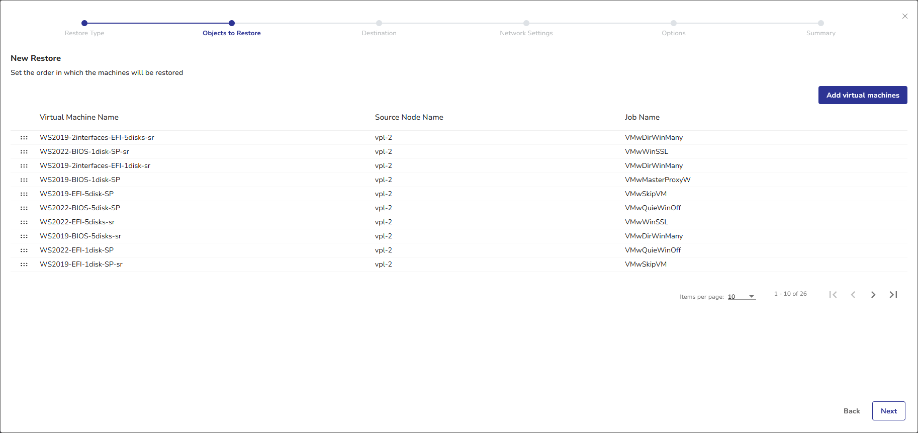 For optimized performance, VMs are restored one by one rather than simultaneously. The order of the VMs in the list reflects the order in which the machines will be restored. To change the order, see Change Virtual Machine Restore Order below.