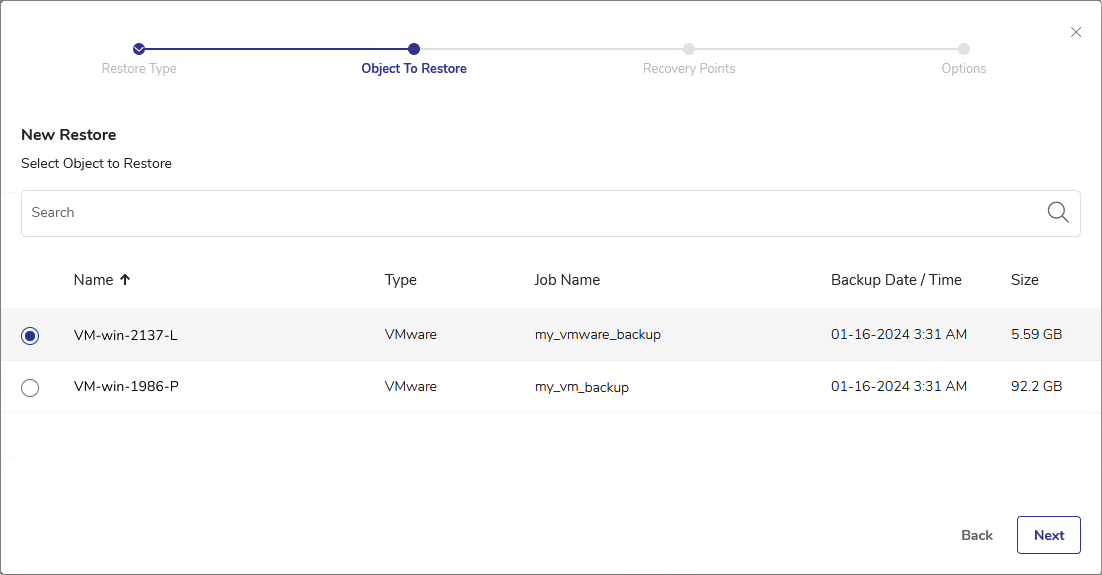 - The VM object list shows all VMs that you backed up by using the DPX Agentless Backup. The available objects to restore can be sorted by Name, Type, associated Job Name, the Backup Date/Time, or by Size.