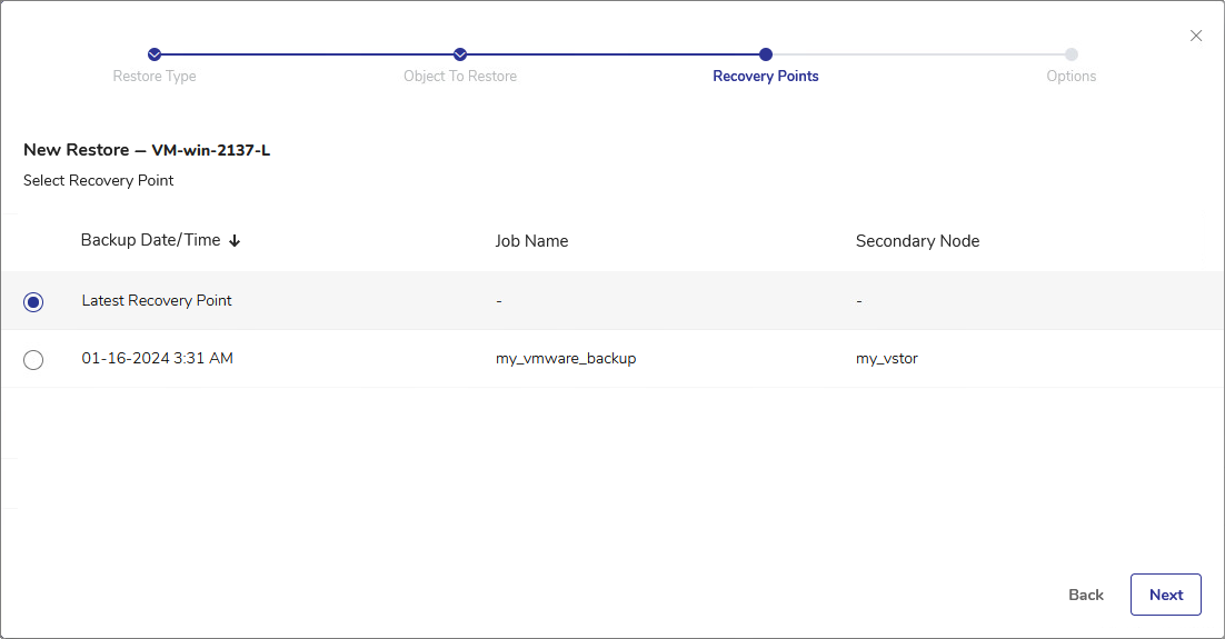 - In the Recovery Points step, select the recovery point to restore. You can select the Latest Recovery Point or either one of the other recovery points in the list.