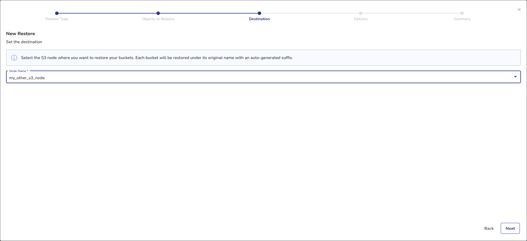 - In the Destination step, use the drop-down menu to select the S3-compatible node name where you want to restore your buckets.