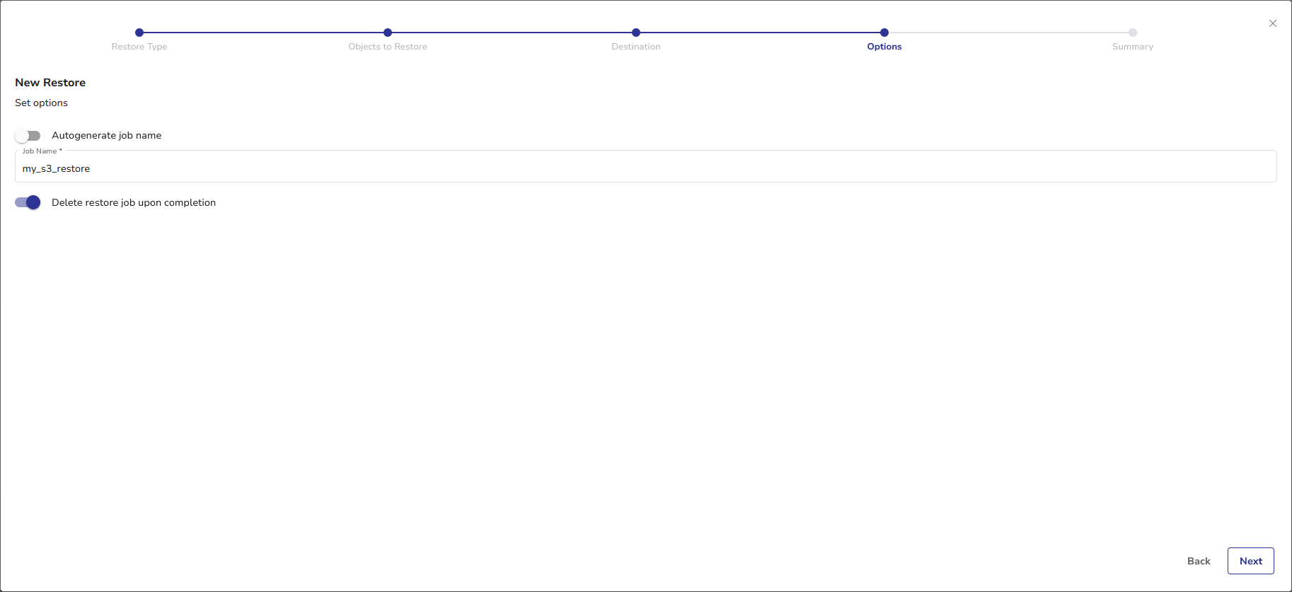 - In the Options step, you can let DPX autogenerate the restore job name (recommended for one-time jobs). If you switch the toggle to disabled, the Job Name input field appears, where you can define the custom name for the job (recommended for long-existing jobs).