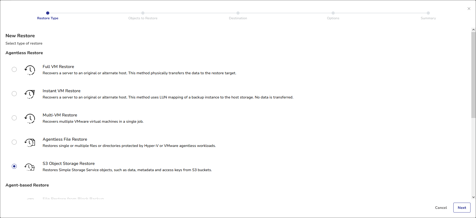 This restore mode is used to restore S3-compatible buckets backed up using S3 Object Storage backup jobs. The restore process is performed at the bucket level; restoring individual objects is not supported.
