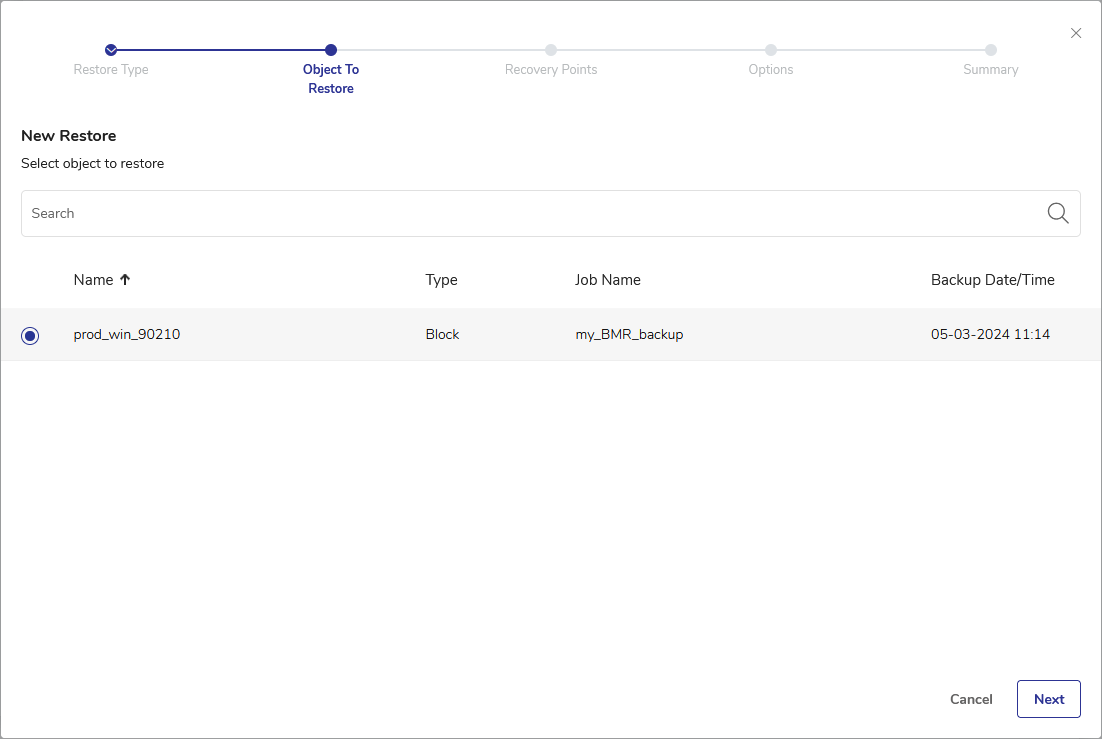 - The Object to Restore list shows all machines backed up using the DPX BMR Backup. The available objects can be sorted Name, Type, associated Job Name, or Backup Date/Size.