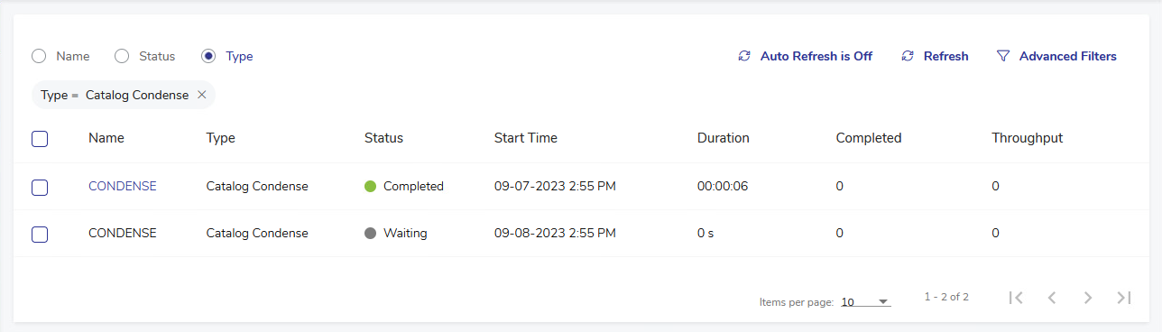 You can also control the view by ordering items by Name, Type, Status, Start Time, Duration, Completion stage and Throughput. Just click the column header to enable ascending/descending ordering.