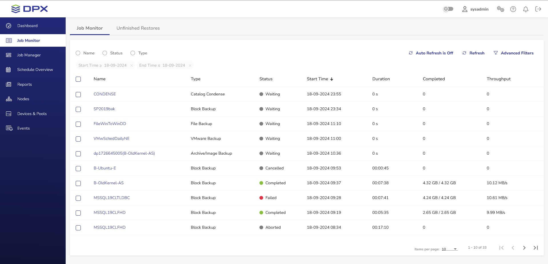 The Job Monitor view consists of two tabs: the traditional Job Monitor tab and the Unfinished Restores tab.