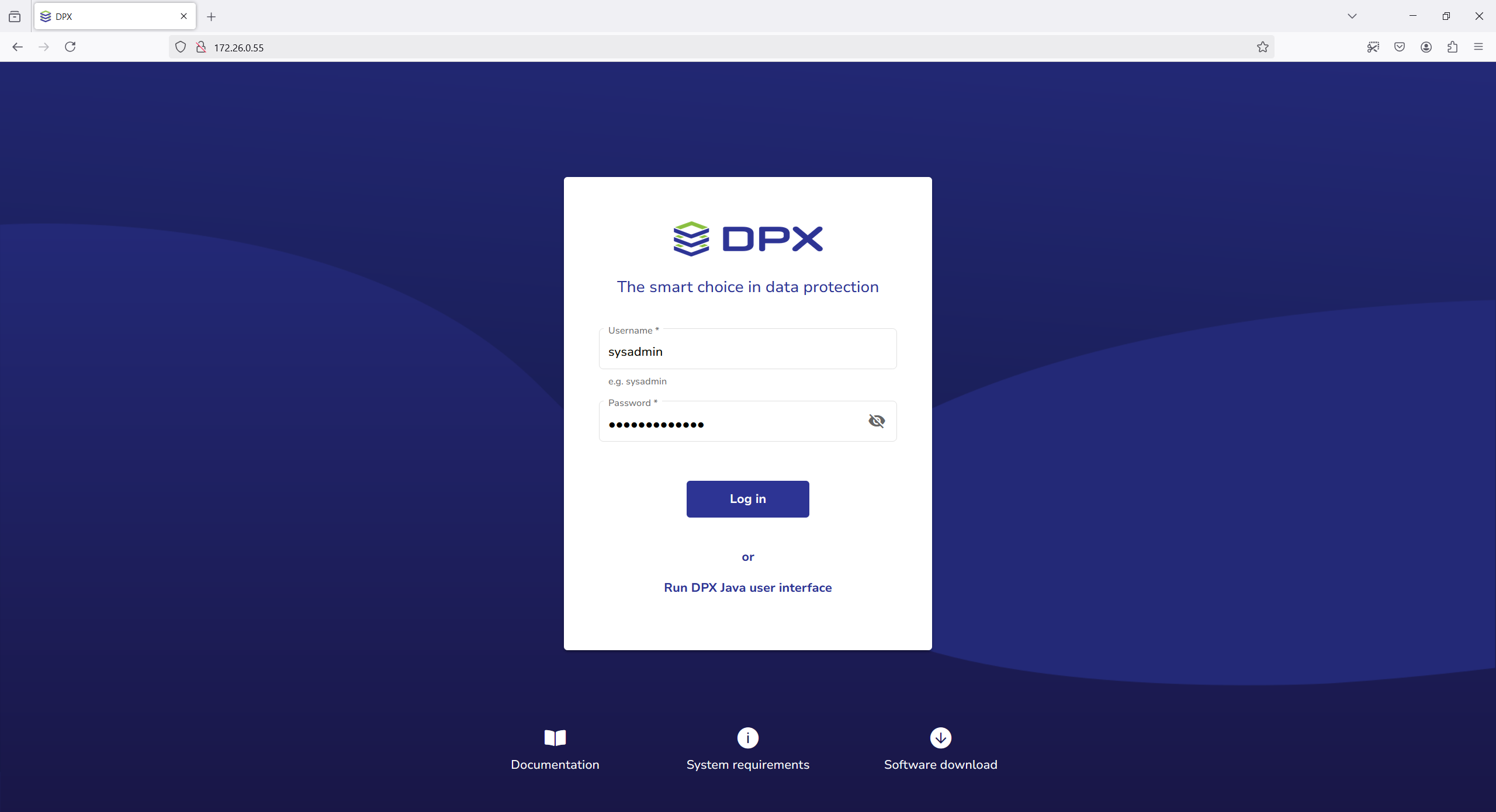 From this screen, you can also launch the classic desktop interface, by clicking the Run The DPX Java User Interface button below the Login button. See Launching the Catalogic DPX Master Server desktop interface for more details.
