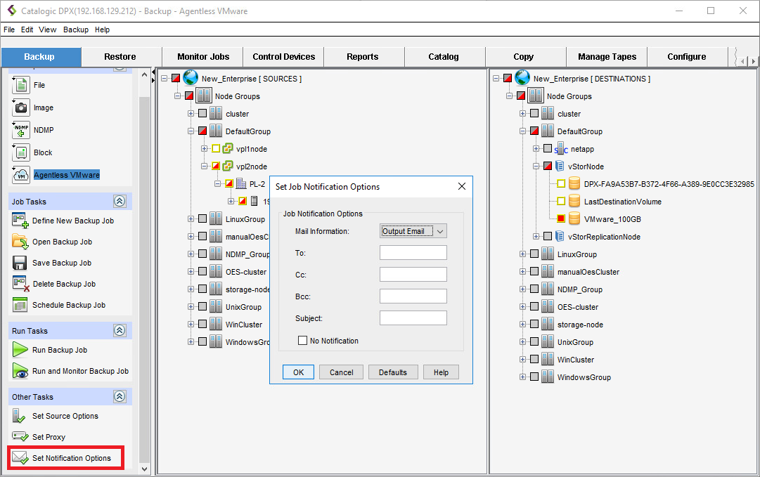 Apart from source options, DPX offers some additional backup job options, such as Job Notification Options. They are available from both interfaces as presented below.