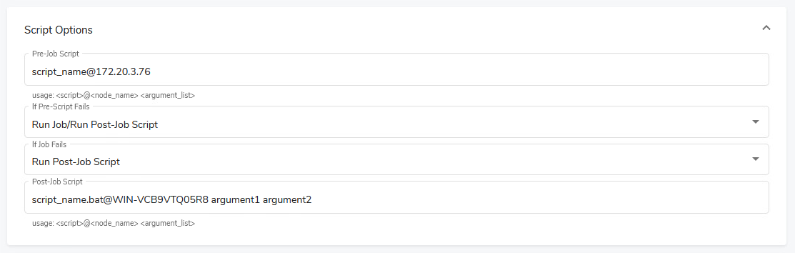 For detailed information about pre- and post-job scripts, including all valid definitions, see Pre-Scripts and Post-Scripts.