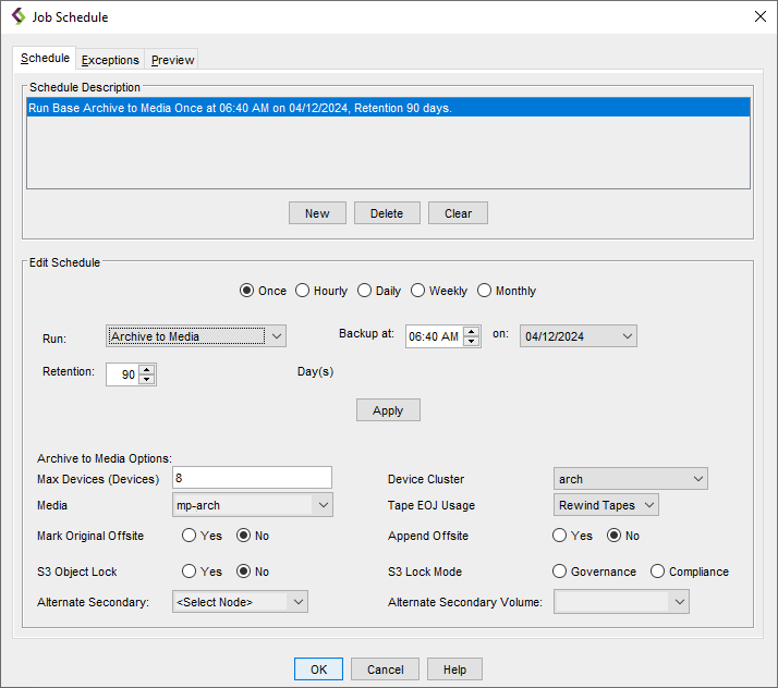 - From the Run drop-down list, select the job type you are scheduling. Archive to Media stands for Base Archive.