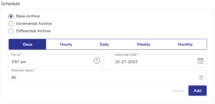 Add schedules for Base, Incremental and Differential Archive backups according to your requirements.