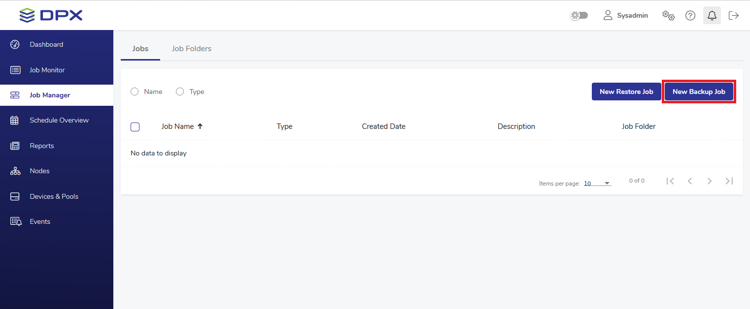 1. In the main web interface view, go to Job Manager in the sidebar. Then select the New Backup Job button in the upper right corner.