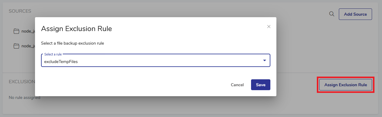 - Optionally, set exclusion rules for files of a certain type. Click Assign Exclusion Rule in the EXCLUSIONS pane to select one of the already existing exclusion rules.