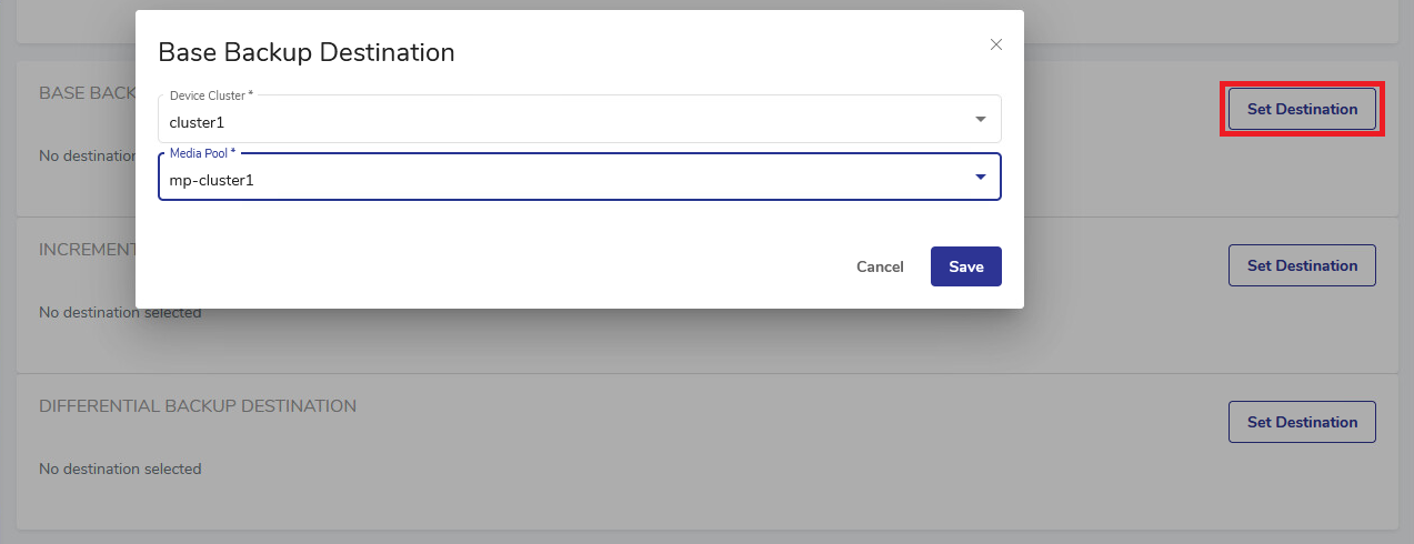 - The INCREMENTAL BACKUP DESTINATION and DIFFERENTIAL BACKUP DESTINATION panes are pre-populated as per the base backup destination. You may change that by clicking Set Destination in respective panes. Note that both these destinations are required for saving the job.