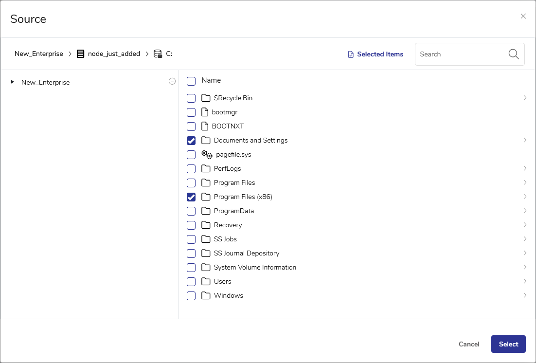 - Click Add Source in the SOURCES pane to specify which volumes you want to back up. The Source selection dialog will appear. Select the desired volumes and click Select.