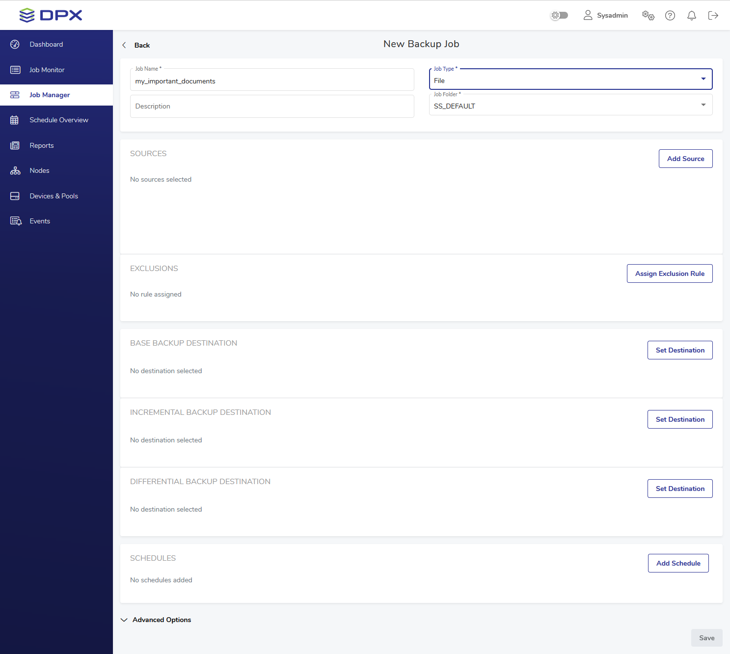 Before running a file backup, you need to create a File Backup Job. To do this, use either of the DPX interfaces.