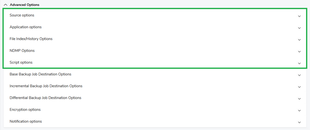 The Advanced Options section in the web interface also includes job destination options which are discussed in a separate section for the sake of clarity. See Job Destination Options for File Backup.