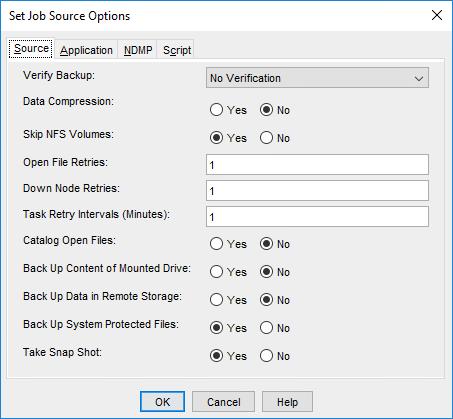 The Set Job Source Options dialog allows you to set options related to backup sources. This section provides an explanation of each field in the dialog and the available choices.