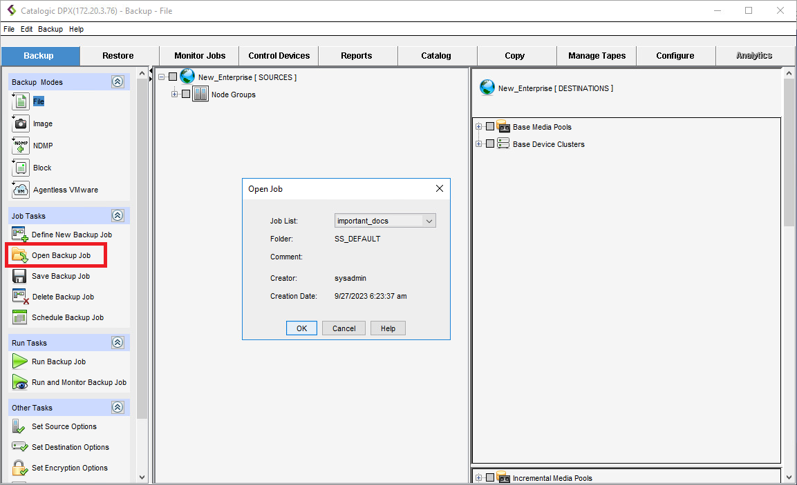 - Under Job Tasks in the side panel, select Open Backup Job.