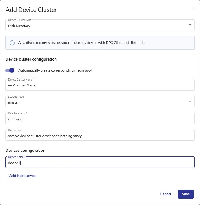 2. Under Devices configuration, specify at least one name for a new device that will be created with the cluster. Select Add Next Device to add more devices. Click the X symbol to the right of the new Device Name to cancel adding this device.