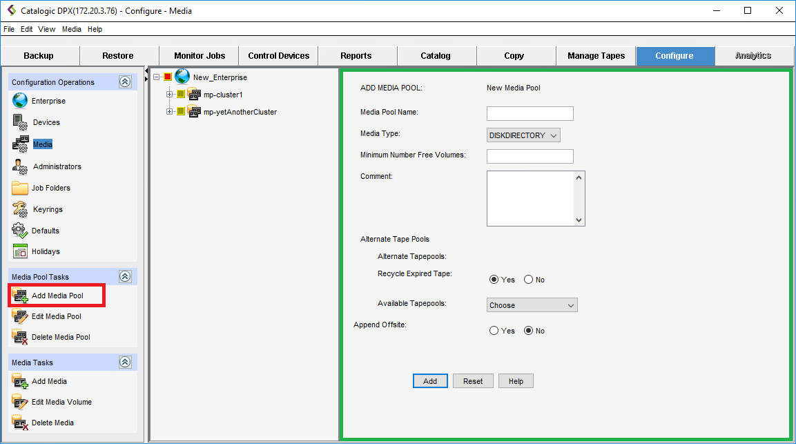 Switch to the Media Pools tab, then select the Add Media Pool button in the upper right corner.