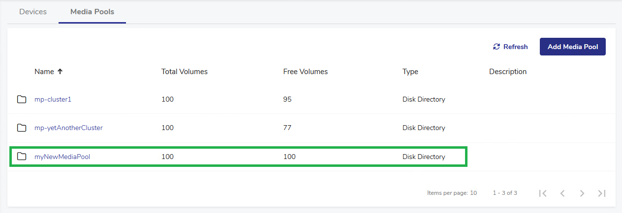 If you have added a device cluster through the web interface and kept the Automatically create corresponding media pool Toggle on, some media pools (with the mp- prefix may already be on the list. They will be of Disk Directory type. Otherwise, the list is empty. See Adding a Device Cluster.