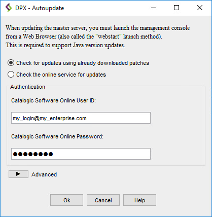 Click Help > Autoupdate DPX in the menu bar or press [Ctrl + E] to open the Autoupdate dialog.