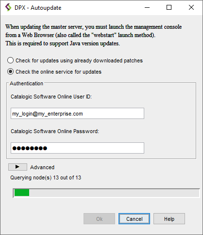1. The Catalogic DPX Master Server automatically tests if it can update all nodes in its Enterprise. If the test succeeds, you will see another Autoupdate dialog.