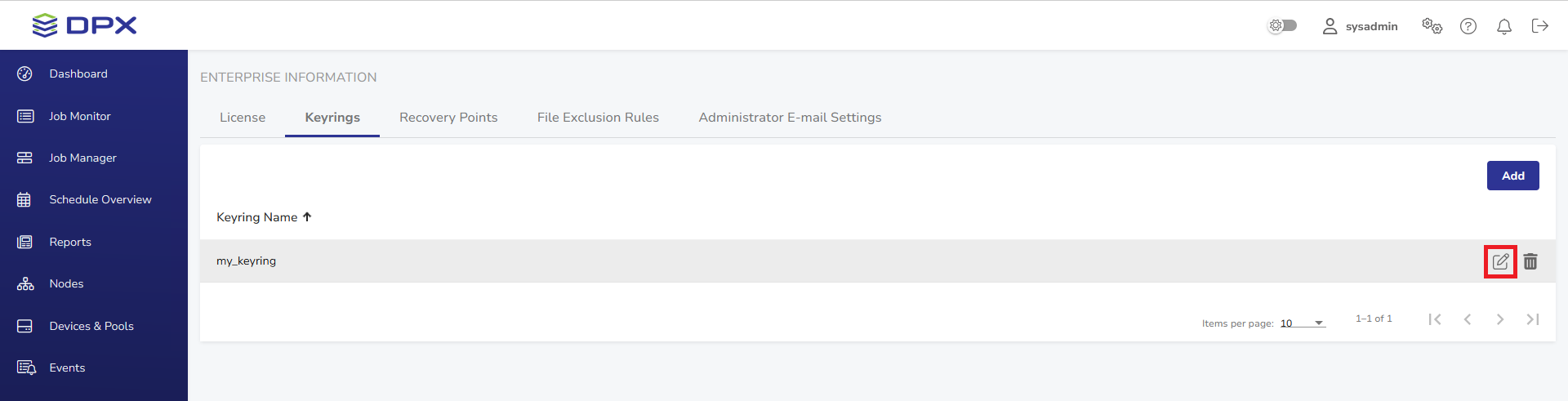 The tab lists all keyrings created by the DPX administrator.
