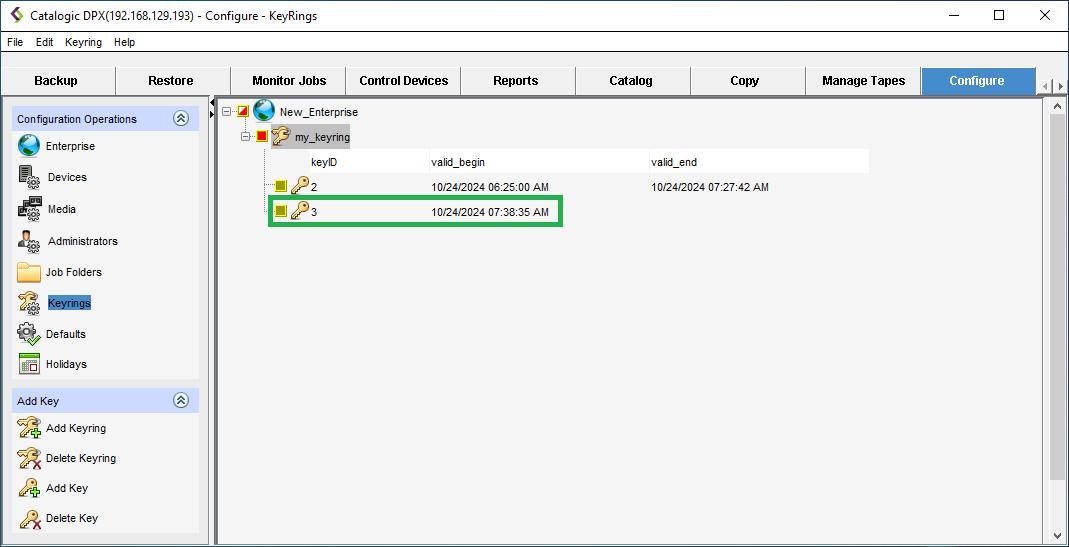 Each key in a keyring is assigned to a period when it is applicable for backup and migrate jobs. At any time, only one key in a keyring is applicable. The other keys in a keyring, although retired, may still be needed for restore and migrate jobs.