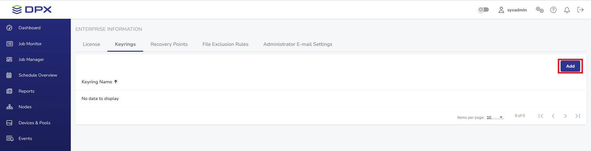 The tab lists all keyrings created by the DPX administrator.